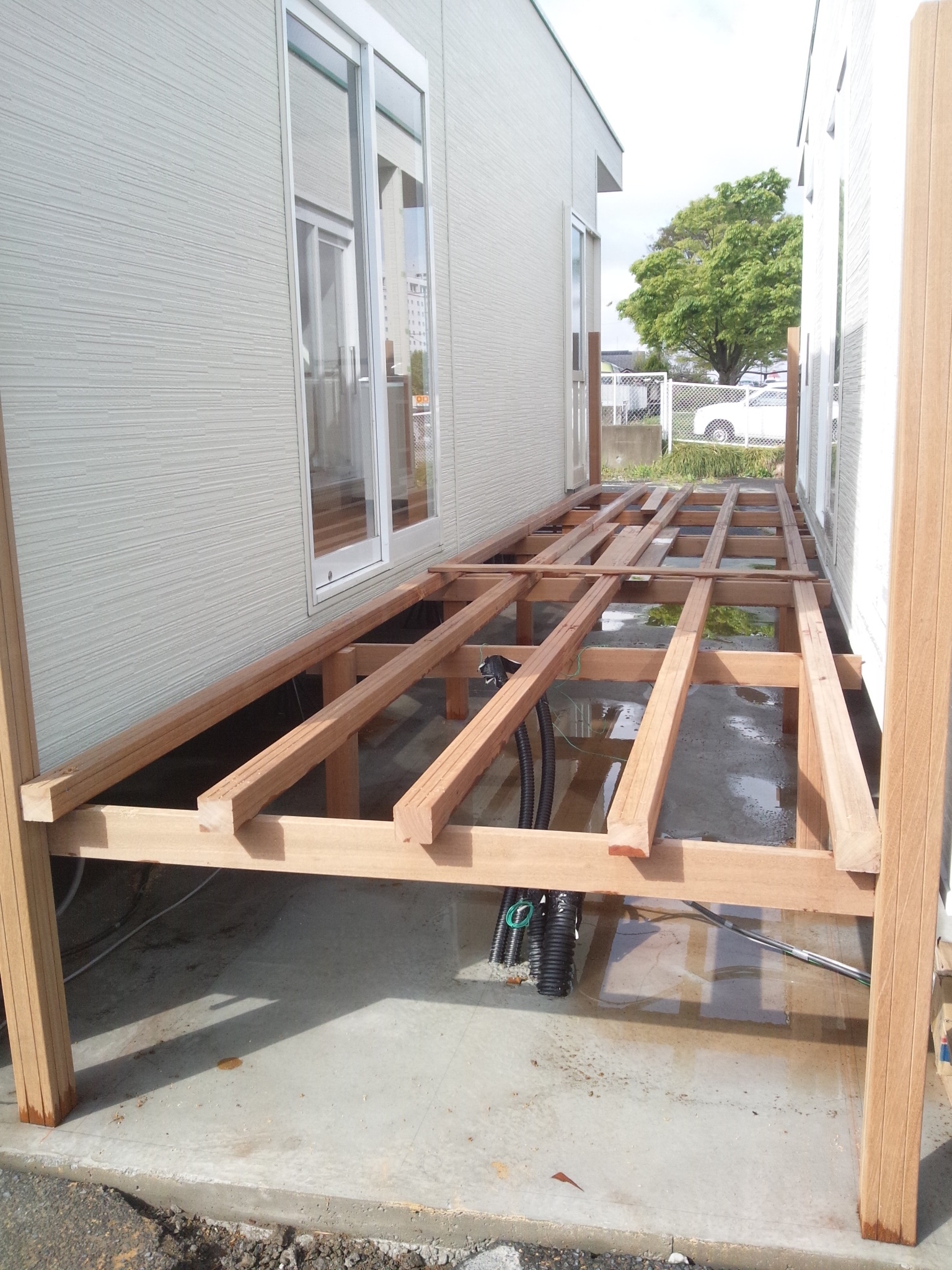 2台のトレーラーハウスの間をつなぐウッドデッキを作らせて頂きました。
