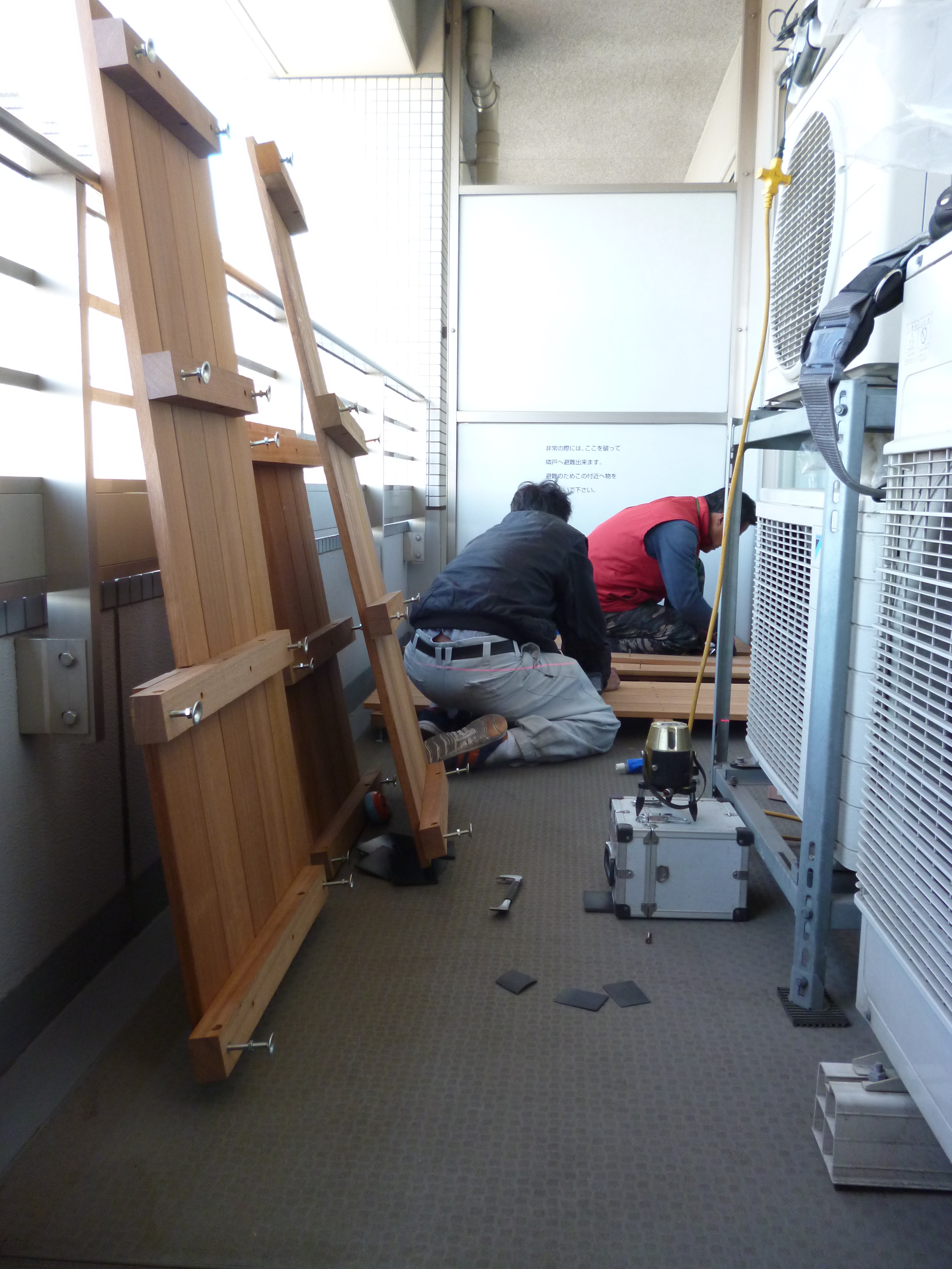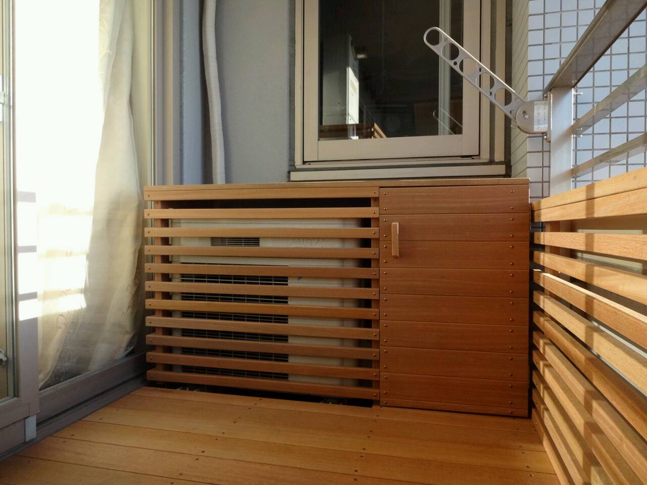 反対側からみたところです、室外機カバーが隠されホッとできるスペースになりました 左側はエアコンカバーと給湯器カバーです